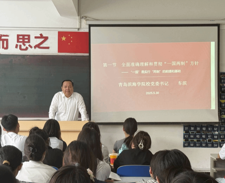 校领导定期进课堂、带头讲思政课是滨海学院的传统。课堂上,车滨以宽广的视野、鲜活的实例、详实的数据,为2024级财管专升本、土木专升本的学生们围绕“坚持‘一国两制’和推进祖国完全统一”主题,讲授《习近平新时代中国特色社会主义思想概论》课程。课程紧密联系实际,回答学生关注,精准阐释政策,号召同学们加强理论武装,听党话、跟党走,锤炼过硬本领,勇于担当进取,用实际行动为实现中华民族伟大复兴贡献青春力量。